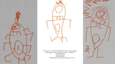 Il virus ha un potere trasforma l’aria, spacca tutto, distrugge la luna, il sole, i giochi, i telefoni. (GREGORIO) Illustrazione di Gregorio Busani, 4 anni