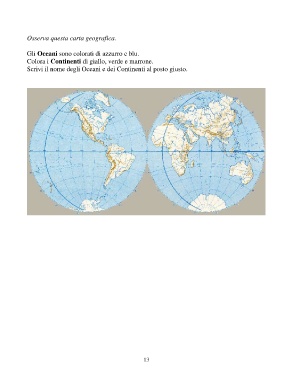 Osserva questa carta geografica. Gli Oceani sono colorati di azzurro e blu. Colora i Continenti di giallo, verde e marrone. Scrivi il nome degli Oceani e dei Continenti al posto giusto. 13
