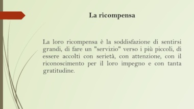 La ricompensa La loro ricompensa è la soddisfazione di sentirsi grandi, di fare un "servizio" verso i più piccoli, di essere accolti con serietà, con attenzione, con il riconoscimento per il loro impegno e con tanta gratitudine.