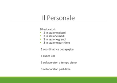 Il Personale 10 educatori: ▪ 2 in sezione piccoli ▪ 3 in sezione medi ▪ 2 in sezione grandi ▪ 3 in sezione part-time 1 coordinatrice pedagogica 1 cuoca CIR 3 collaboratori a tempo pieno 3 collaboratori part-time