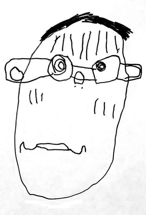 Io lo descriverei…che sorride, è bello! Ha le labbra rosse e un sorriso sublime…va bene questa parola? Ha le rughe che sono come ondine, è normale…è una specie di screpolatura della pelle della faccia. È un po’ ruvida solo sul mento, perché ha la barba e io la sento quando gli do i bacini e lui me li dà a me, a vicenda, perché ci vogliamo bene a vicenda! Nel mento ha due rughe che scendono a cupola, così, (indica la direzione col movimento della mano). Il suo mento sembra quasi il rotolo del ginocchi, solo un po’ più piccolo. Non è troppo vecchio, è ancora normale!