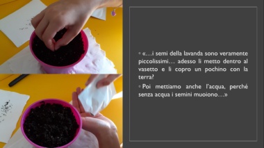 ◦ «…i semi della lavanda sono veramente piccolissimi… adesso li metto dentro al vasetto e li copro un pochino con la terra? ◦ Poi mettiamo anche l’acqua, perché senza acqua i semini muoiono…»