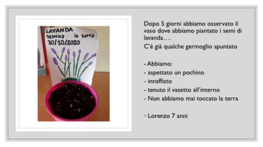 Dopo 5 giorni abbiamo osservato il vaso dove abbiamo piantato i semi di lavanda…. C’è già qualche germoglio spuntato - Abbiamo: - aspettato un pochino - innaffiato - tenuto il vasetto all’interno - Non abbiamo mai toccato la terra ◦ Lorenzo 7 anni